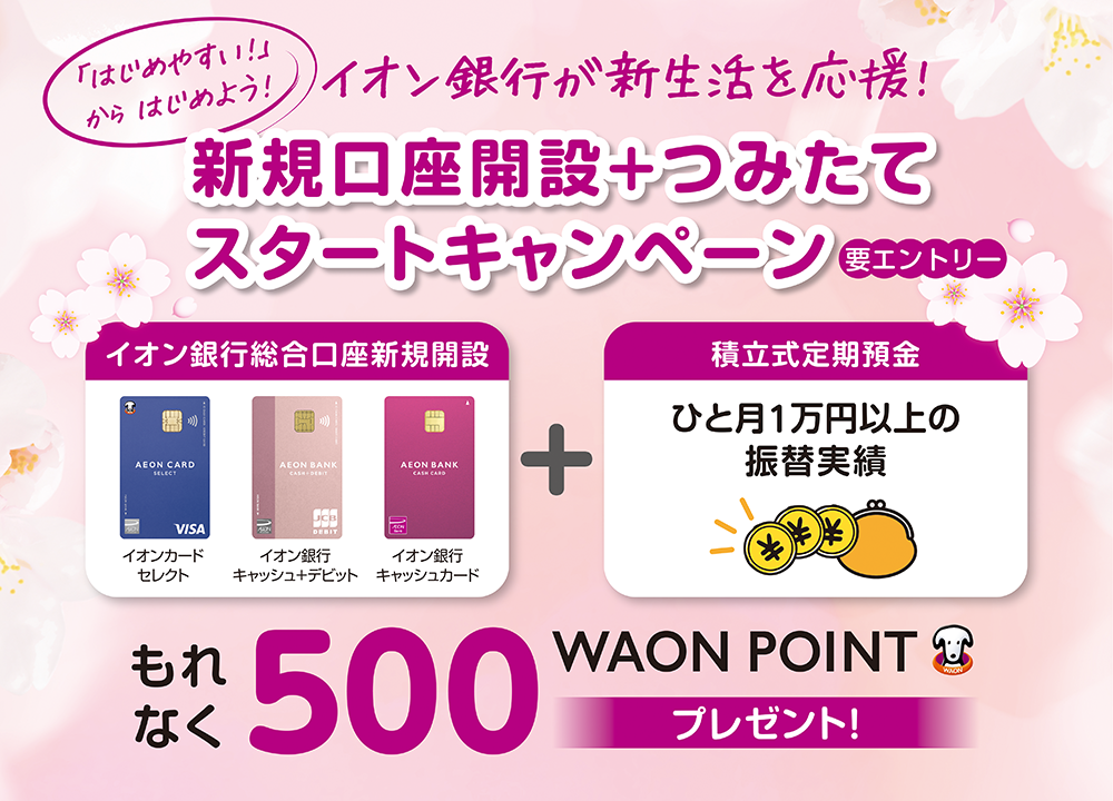 • 本キャンペーンは新規口座開設が対象となりますので、すでにイオン銀行口座をお持ちの方および対象カード同士のお切替えや再発行などの場合は対象外となります。
