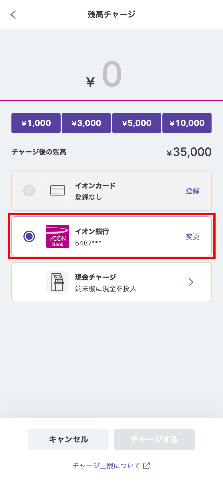 「銀行口座から」をタップしチャージ金額を入力してチャージ
