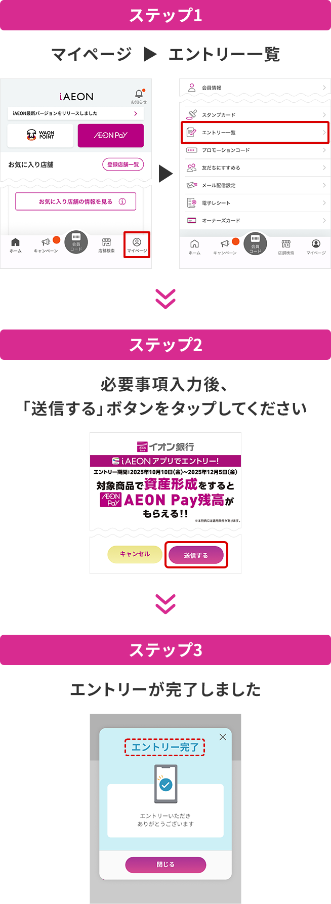 お客さま登録情報一致の確認は、当社の登録電話番号とiAEONの登録電話番号が一致しているかで判断を行うため、一致しているかご確認の上エントリーをお願いします。
