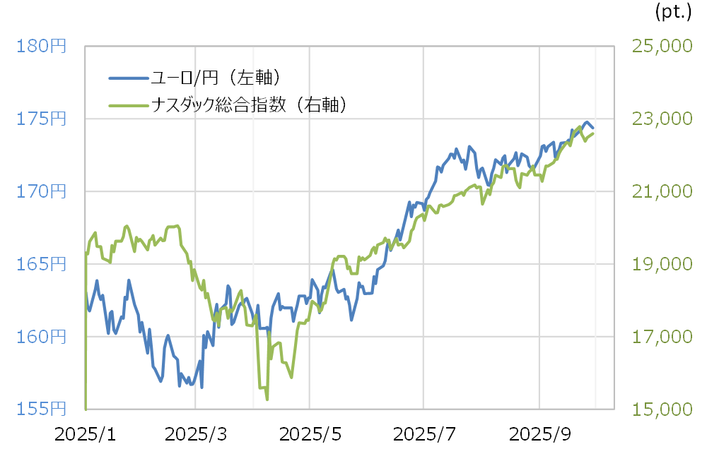 ユーロ/円は、6月頃から大きく上昇に向かうと、先週(9月22日週)は一時175円以上に上昇し、2024年7月に記録した最高値に急接近した。この動きは、世界的な株高の動き、特にそれをリードする形となったハイテク株の構成が大きい米ナスダック総合指数と高い相関関係が続いていた(図表1参照)。