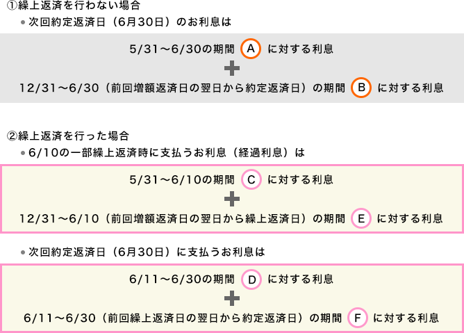 増額返済併用のお客さまは、毎月ご返済分借入残高については前回約定返済日の翌日から繰上返済日まで、増額返済分借入残高については前回増額返済日の翌日から繰上返済日まで、それぞれの経過日数に約定の利率を乗じて計算したお利息です。