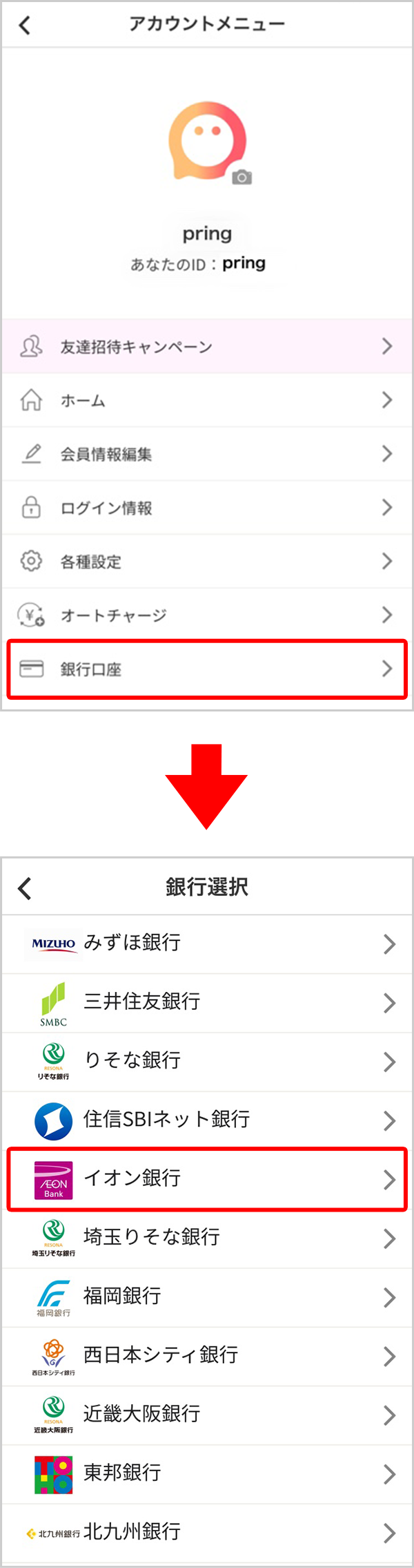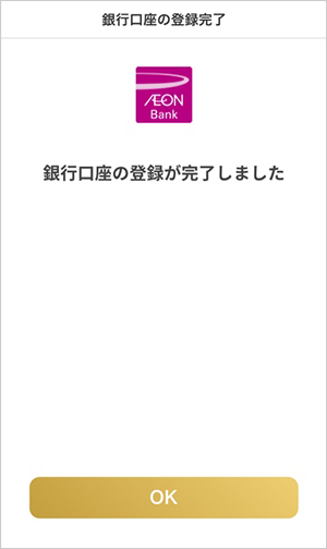 アカウントメニュー画面で「銀行口座」をタップ、「新規口座の追加」からイオン銀行を選択し、画面の案内に沿って口座情報を入力する。