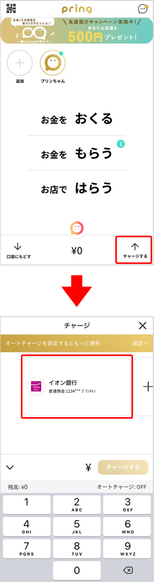ホーム画面「チャージする」をタップ、イオン銀行を選択する。