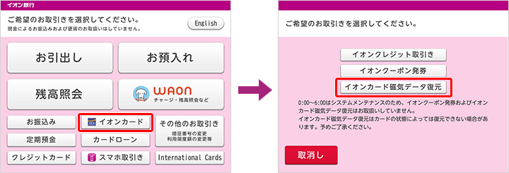 イオン銀行ATM取引画面の「イオンカード」ボタンから「イオンカード磁気データ復元」ボタンを選択してください。 復元の操作画面に進みますので、画面の表示に従って操作ください。