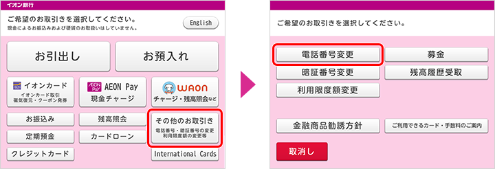 - インターネットバンキングにログイン後、「氏名・住所・電話番号変更」メニューから画面に従って操作してください。インターネットバンキングの画面操作方法についてはこちら