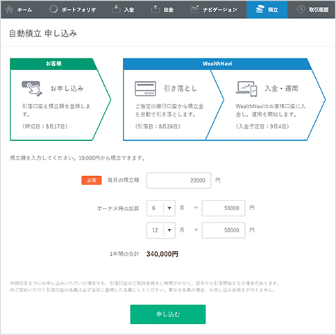 自動積立機能を利用すれば、銀行口座から一定の積立額を毎月1回引き落とし、WealthNavi口座に入金を行い、自動的に資産運用を行うことが可能です。
