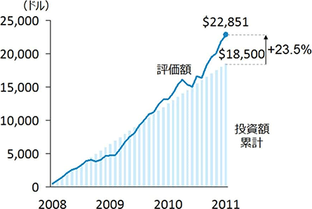 2008年1月からの3年間でS&P500指数は暴落して元の水準まで戻っただけですが、同じ期間に同指数に毎月500ドルを積立投資していた場合のリターンを試算してみると、最終的な評価額は投資額の累計より23.5%増えるという結果になりました(図表2)。